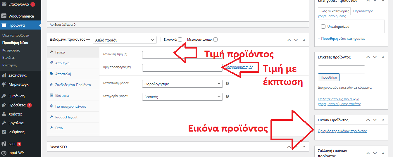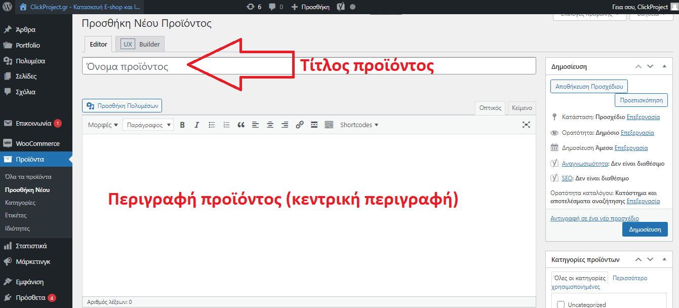 Επιλέγουμε Προϊόντα > Προσθήκη Νέου. Στη συνέχεια συμπληρώνουμε τον τίτλο και την κεντρική περιγραφή του προϊόντος στα σημεία που φαίνονται στην εικόνα. Κεντρική περιγραφή είναι το κείμενο που βρίσκεται κάτω από την εικόνα του προϊόντος στην σελίδα του προϊόντος. Συνήθως πρέπει να περιέχει όσο περισσότερες πληροφορίες γίνεται, ώστε να βοηθά τους επισκέπτες αλλά να προσφέρει και κέρδος σε SEO. Είναι διαφορετική από την σύντομη περιγραφή που συνήθως βρίσκεται δίπλα και πάνω από το κουμπί Προσθήκη στο Καλάθι.